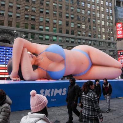 속옷브랜드 신제품 수영복 출시 홍보 목적 미국의 인플루언서 겸 모델 킴 카다시안(44)이 운영하는 속옷 브랜드 ‘SKIMS’가 미국 뉴욕 시내 한복판에 초대형 비키니 차림의 홍보 풍선을 설치했다가