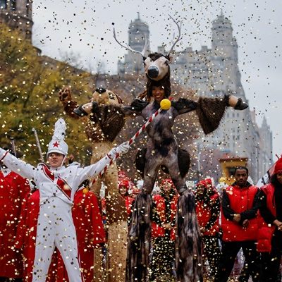 2024년 11월 28일 뉴욕 – 메이시스 백화점의 전통적인 연례 행사인 추수감사절 퍼레이드를 앞두고 맨해튼에서 공연자들의 최종 리허설이 진행되고 있다. 매년 수백만 명의 관람객들이 지켜보는 이