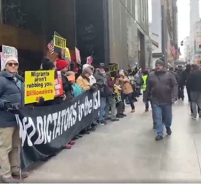 뉴욕 맨해튼 트럼프 타워 앞에서 2일(현지시간) 오후 대규모 시위가 벌어졌다. 맨해튼 미드타운 5번가 727번지에 위치한 트럼프 타워 주변에는 오후 1시 39분경부터 수백 명의 시위대가 모여들기
