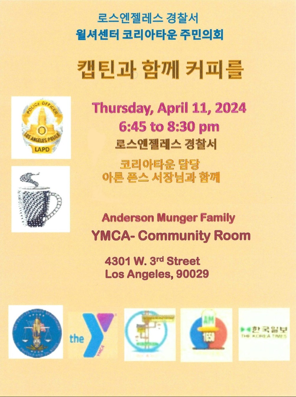 월셔센터 코리아 타운 주민의회가 주최하는 커피타임 위드 더 캡틴 행사가 오는 목요일로 다가온 가운데 주민의회측이 많은 한인들의 참여를 부탁하며 한인들이 소통할 수 있는 좋은 기회가