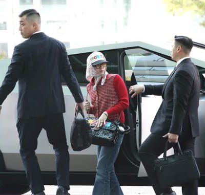 가수 지드래곤(GD)이 해외 일정을 위해 4일 인천국제공항 2터미널에 도착해 테슬라의 전기 픽업트럭 사이버트럭(Cybertruck)에서 하차하고 있다. 뉴스1 그룹 빅뱅 지드래곤이 샤넬 2024/25 크루즈 레플리카 쇼 참석을