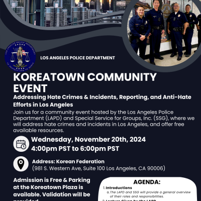 오는 20일 LAPD 주최로, 엘에이 한인회관에서 증오범죄 관련 세미나가 열립니다 팬데믹을 전후로 급증한 증오범죄는 시니어와 여성 등을 겨냥해 빈발하고 있고 불특정 개인을 상대로 벌어지는 일이라,