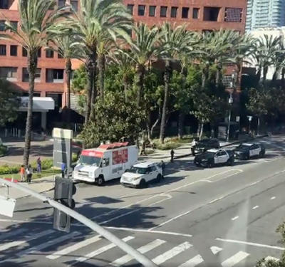 로스앤젤레스 다운타운이 충격에 휩싸였습니다. 오늘 오후 3시 36분, Dignity Health California Hospital Medical Center 앞, 1401 South Grand Avenue에서 20명에 달하는 집단이 한 사람을 공격했다는