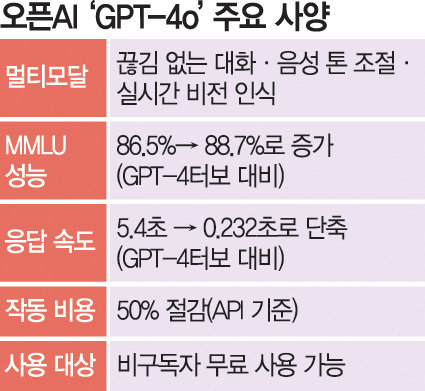 챗GPT 개발사인 오픈AI가 사람처럼 보고 듣고 말하는 ‘옴니모델’ 인공지능(AI) ‘GPT-4o’를 13일(현지 시간) 전격 공개했다. GPT-4o는 기존 ‘GPT-4 터보’보다 성능이 개선됐으며 50% 저렴한 비용으로 구동 가능해