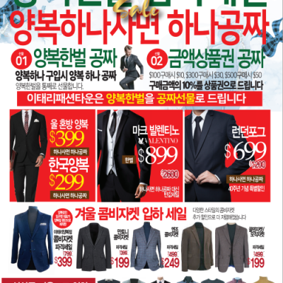 양복 1+1과 10% 캐시 상품권 제공으로 고객 감사 보답 LA 한인타운의 대표적인 남성 정장 전문점 3100 윌셔 이태리패션타운이 연말을 맞아 파격적인 감사 세일을 실시한다. 이번