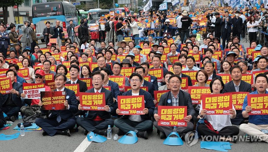 민주당 등 野7당 총집결…”거부권 규탄·특검법 재의결” 여론전이재명 “국민 힘으로 항복시켜야”…조국 “8년 전 일 다시 겪을 것” 더불어민주당을 비롯한 범야권 정당들이 25일 서울 도심 한복판에서 ‘순직
