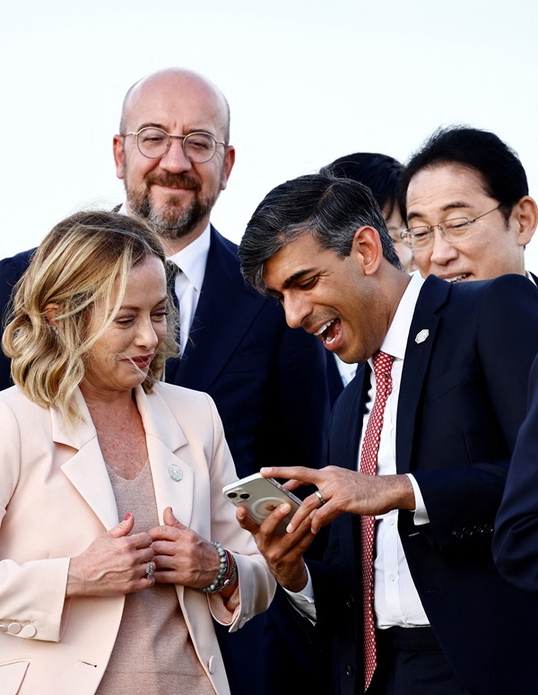 이탈리아 사벨레트리에서 열린 G7 정상회담 2024년 6월 13일 이탈리아 사벨레트리에서 열린 G7 정상회담 첫날, 조르지아 멜로니 이탈리아 총리가 기시다 후미오 일본 총리, 찰스 미셸 유럽평의회