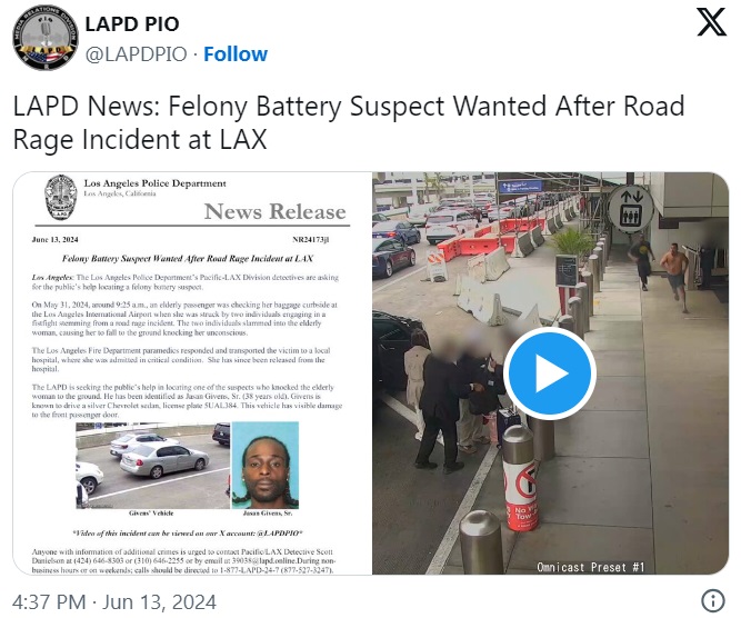 운전자끼리의 싸움으로 LAX 탑승객 중상 경찰은 LA 국제공항에서 수하물을 검사하던 여성을 밀쳐 중상을 입힌 남성 2명 중 한 명을 추적하고 있습니다. 이와 관련한 제보를 위해