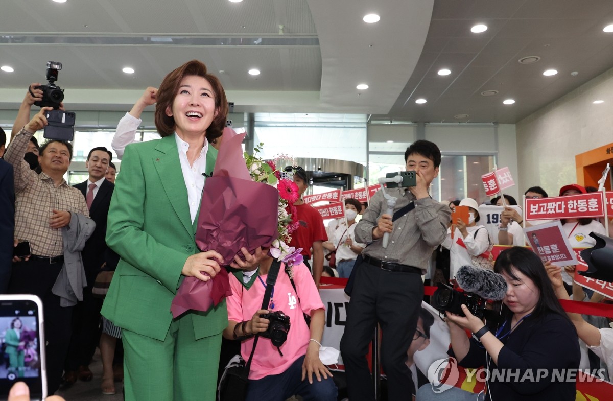 국민의힘 나경원 의원이 23일 국회에서 당 대표 출마선언에 나서며 지지자들에게 꽃다발을 받고 미소짓고 있다. 2024.6.23 0 0