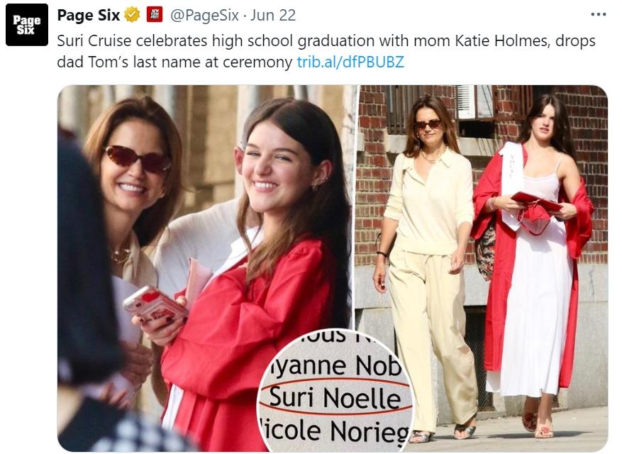 “톰 크루즈 딸 수리, 고교 졸업식서 아빠 성 뺀 이름 사용”