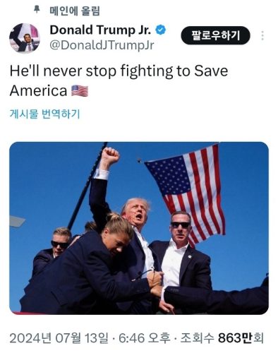 미국 공화당 대선후보인 도널드 트럼프 전 미국 대통령의 선거 유세 현장에서 총격 사건이 발생한 가운데 오른쪽 귀 윗부분이 관통되는 부상을 입은 트럼프 전 대통령은 찰나의