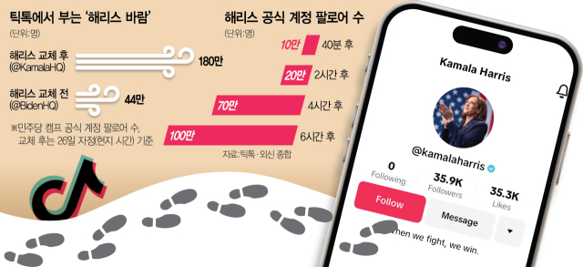■’대중 제재’ 상징 틱톡, 대선 핵심 전장으로6시간만에 팔로어 100만 돌파‘젊고 활기차다’ 젠지 세대 열광해리스 언급량·해시태그 급증지지율·자금 모금으로 이어져트럼프측은 관심 하락에 당황열성 지지층 ‘反해리스 광고’ 미국