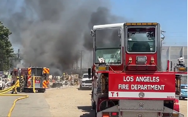 E College St & N Main St. 가 만나는 130 E College St. 부근의 기차 선로 근처에서 발생한 대형 화재가 발생했습니다. 로스앤젤레스 카운티 보안관 남자