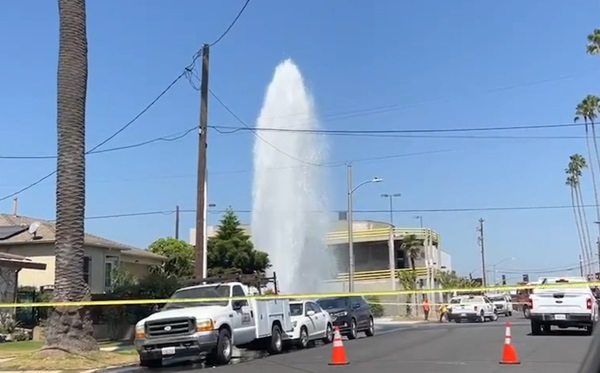 잉글우드 E 라 팔마 드라이브 & 타마랙 애비의 소화전이 파되되어 물이 치솟고 있습니다. 이 지역을 지나시는 분들은 주의 하시기 바랍니다. 소방관들이 절단된 소화전에 대한 911