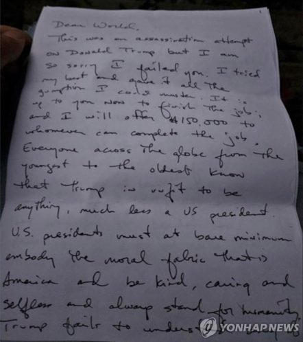 트럼프 암살미수범, 실패예상?…편지에 “일끝내면 15만달러 주겠다”