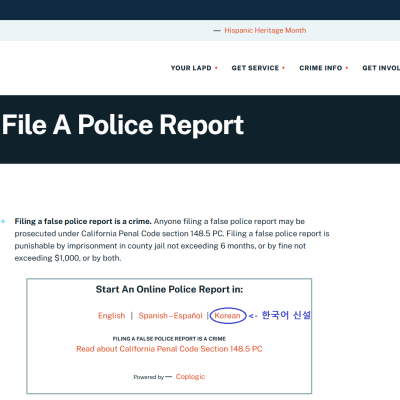 LAPD 신고 웹사이트에 한국어 추가
