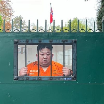 스위스 北대표부에 인권탄압 비판 깜짝광고 유엔의 북한인권 정례검토(UPR)를 하루 앞두고 수의를 입고 철창 속에 갇힌 듯한 김정은 북한 국무위원장의 모습이 담긴 광고 포스터가 스위스에 있는