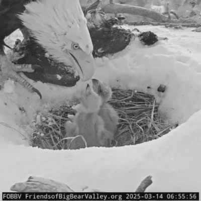 폭설 후 둥지에 남은 건 2마리… ‘자연의 냉혹한 현실’라이브 스트림에 어미 독수리, 2마리에게만 먹이 주는 모습 포착 빅베어의 대머리 독수리 부부 재키와 섀도우의 둥지에서 새끼