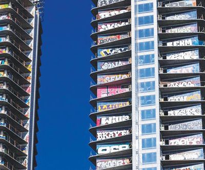 월드컵과 올림픽 앞두고 방치된 고층 건물들, 도시 이미지 우려 커져 로스앤젤레스 도심 스카이라인에 독특한 색채를 더하고 있는 그래피티로 뒤덮인 두 개의 고층 건물이 주목을 받고