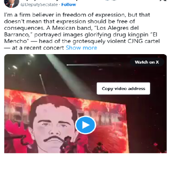미국 국무부는 멕시코 코리도 그룹 로스 알레그레스 델 바랑코(Los Alegres del Barranco)의 멤버들이 지난 3월 29일 과달라하라 대학 강당에서 열린 콘서트 중 멕시코 마약 카르텔인
