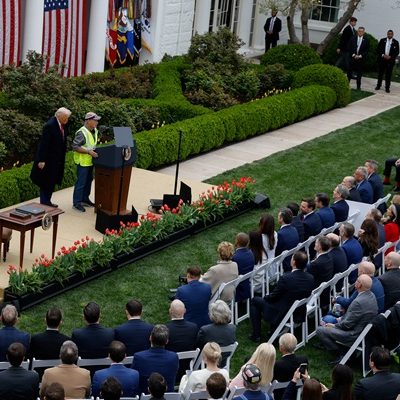 잘 꾸민 정원서 짙은 화장 하고 할리우드 영화 대사 차용 “연극적 행사, 광범위한 충격파 간과하게 만들어” 지적도 도널드 트럼프 미국 대통령의 2일(현지시간) 상호관세 발표는 특유의