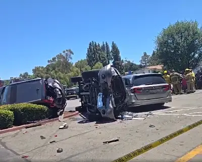 로스코와 토팡가 캐년 교차로 주차장서 차량 뒤집혀… 운전 부주의 추정, 경찰 출동 #파킹랏사고 #차량전복 #운전부주의 #앤젤레스사고 #주차장안전 로스앤젤레스 로스코 블러바드와 토팡가 캐년 블러바드 교차로 인근