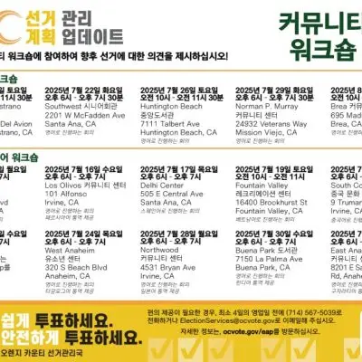 오는 2025년 선거를 앞두고 OC 선거관리국이 선거관리계획 업데이트를 위한 공개 의견 수렴에 나섭니다. OC 선거관리국은 24일, 오는 7월 12일부터 8월 2일까지 카운티 전역에서 15차례의 공개
