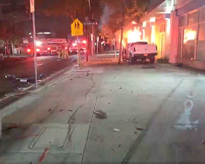 지금 들어온 로스앤젤레스 베니스블러바드와 사우스 그랜드 애비뉴에서 발생한 대형 차량 사고와 화재 현장의 긴급 속보입니다. 로스앤젤레스 경찰과 소방은 오전 2시 57분경 베니스와 그랜드 교차로에서 다수의