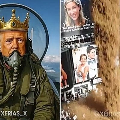 도널드 트럼프 대통령은 토요일 전국적으로 벌어진 대규모 “왕은 없다(No Kings)” 시위에 대해 자신이 왕관을 쓴 군주로서 전투기를 조종하며 아래 시위대에 갈색 액체를 투하하는 AI 생성
